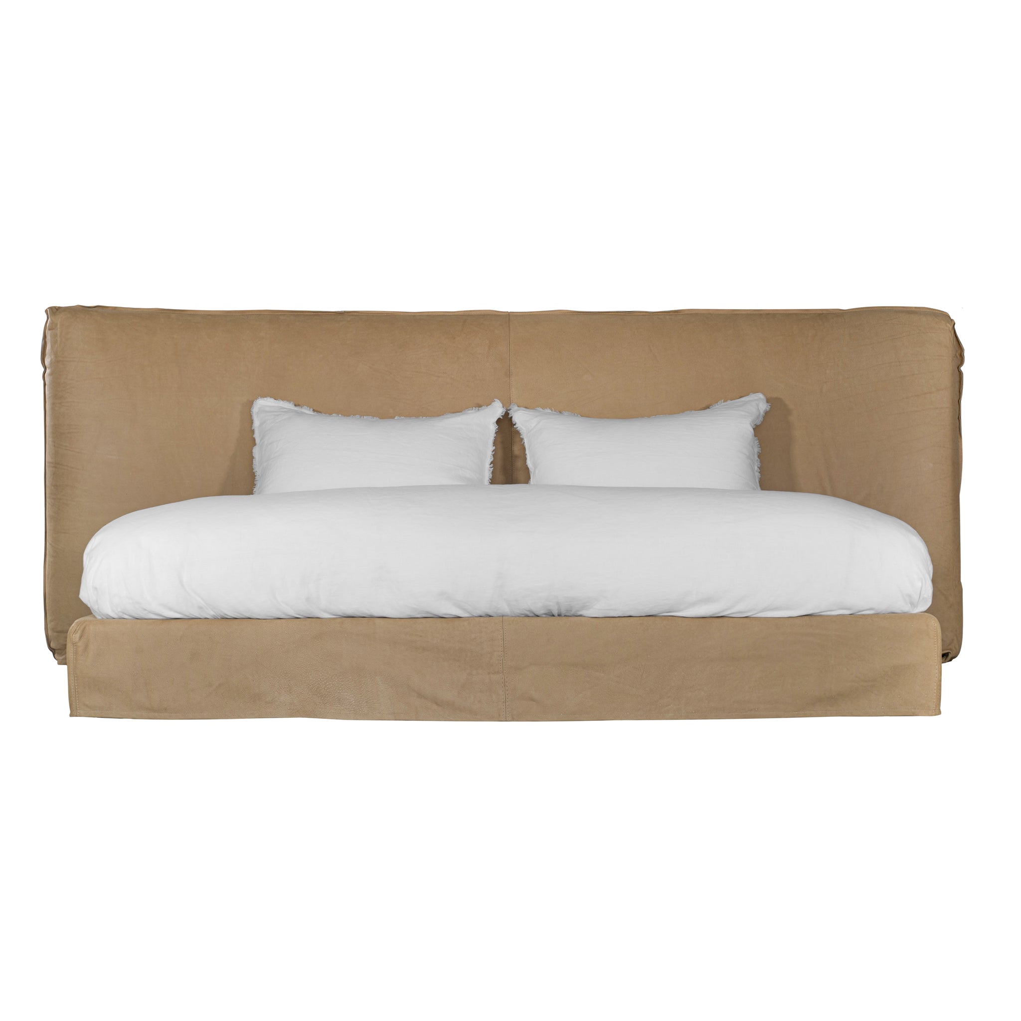 The Mallorca Bed is a refined upholstered bedhead with a slipcover frame that combines minimalist design with the refined elegance of premium full-grain aniline leather, making it a perfect centrepiece for any bedroom.